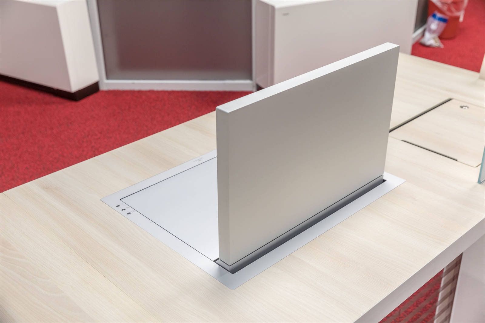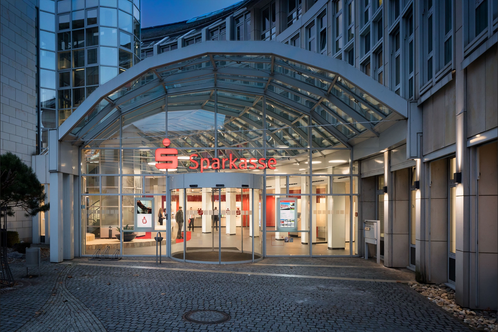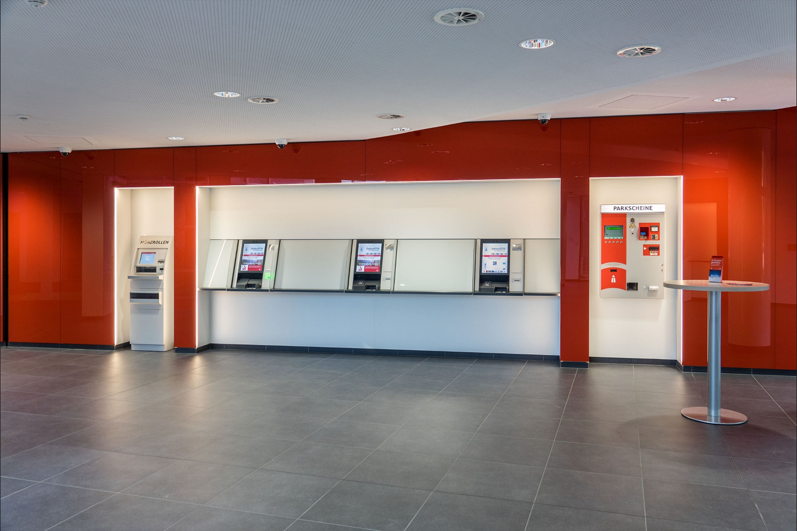 Rotes Glas markiert die gesamte SB-Zone, die schon im Außenbereich mit einem behinderten-gerechten Outdoor-Gerät beginnt und sich hinter der neuen Eingangstür auf beiden Seiten mit entsprechenden Geräten fortsetzt. Diese markante Betonung leitet die Kunden in „ihre Sparkasse“, wo sie von den Mitarbeitern am „Check-In“ empfangen werden.