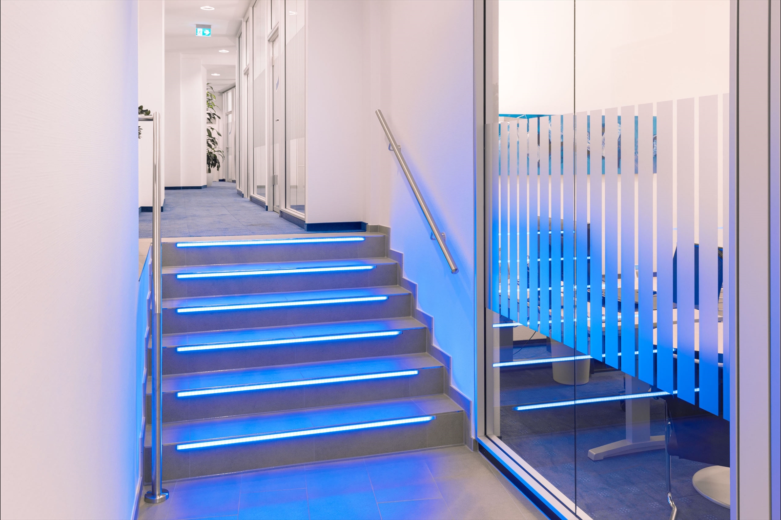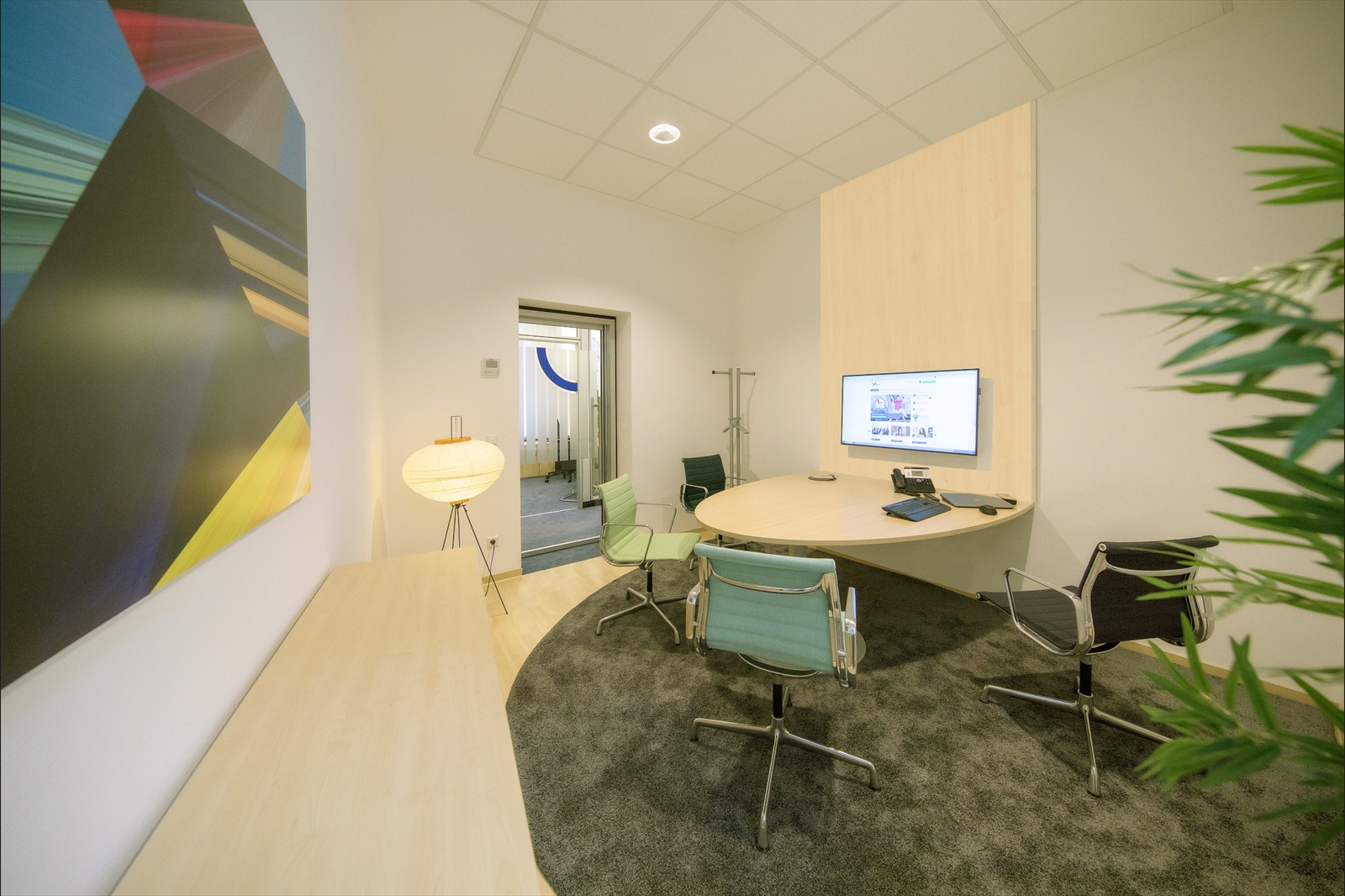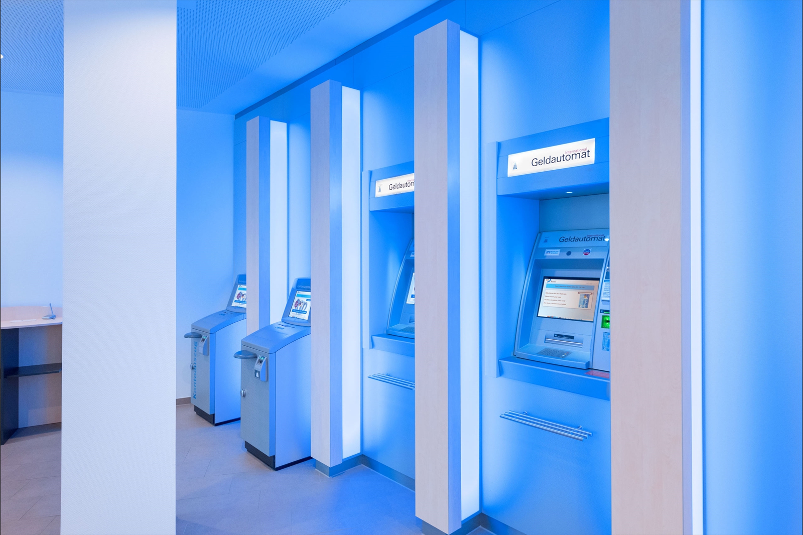 Technik als Imagetransfer setzt sich fort vom Kunden-Serviceterminal mit Touch-Pult, über den großen Monitor im Lounge-Bereich, bis hin zu den großformatigen Bildschirmen an den Wänden der Beraterzimmer, den sogenannten, „Themenräumen“.